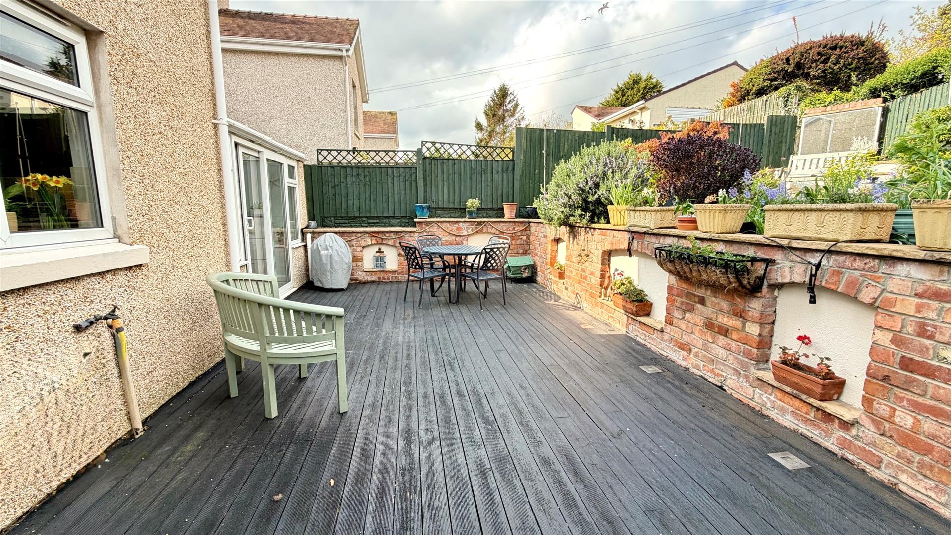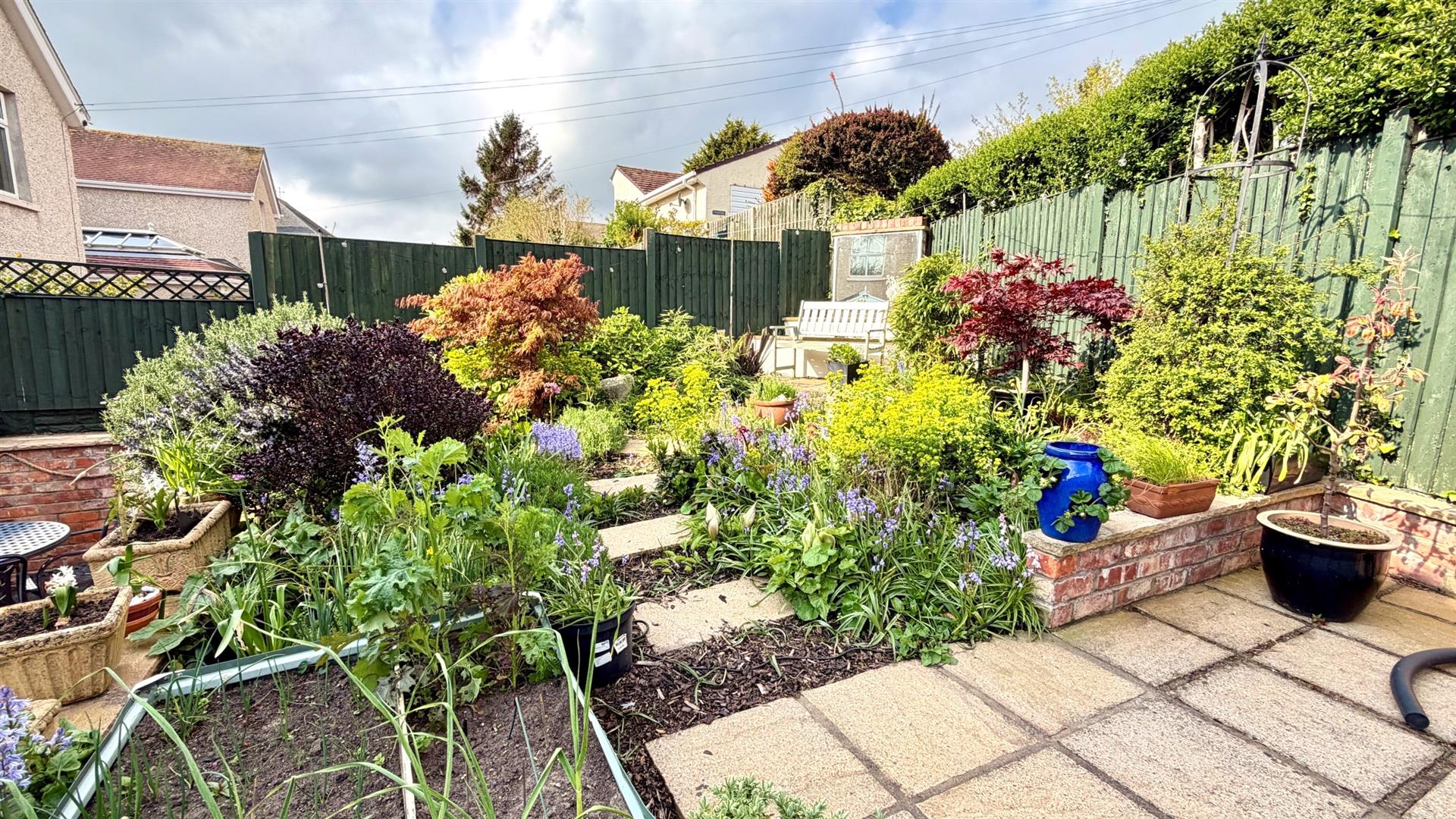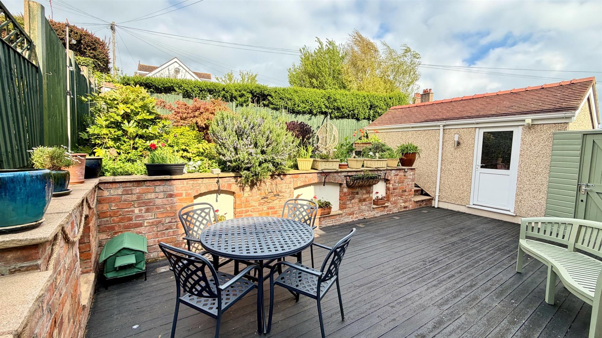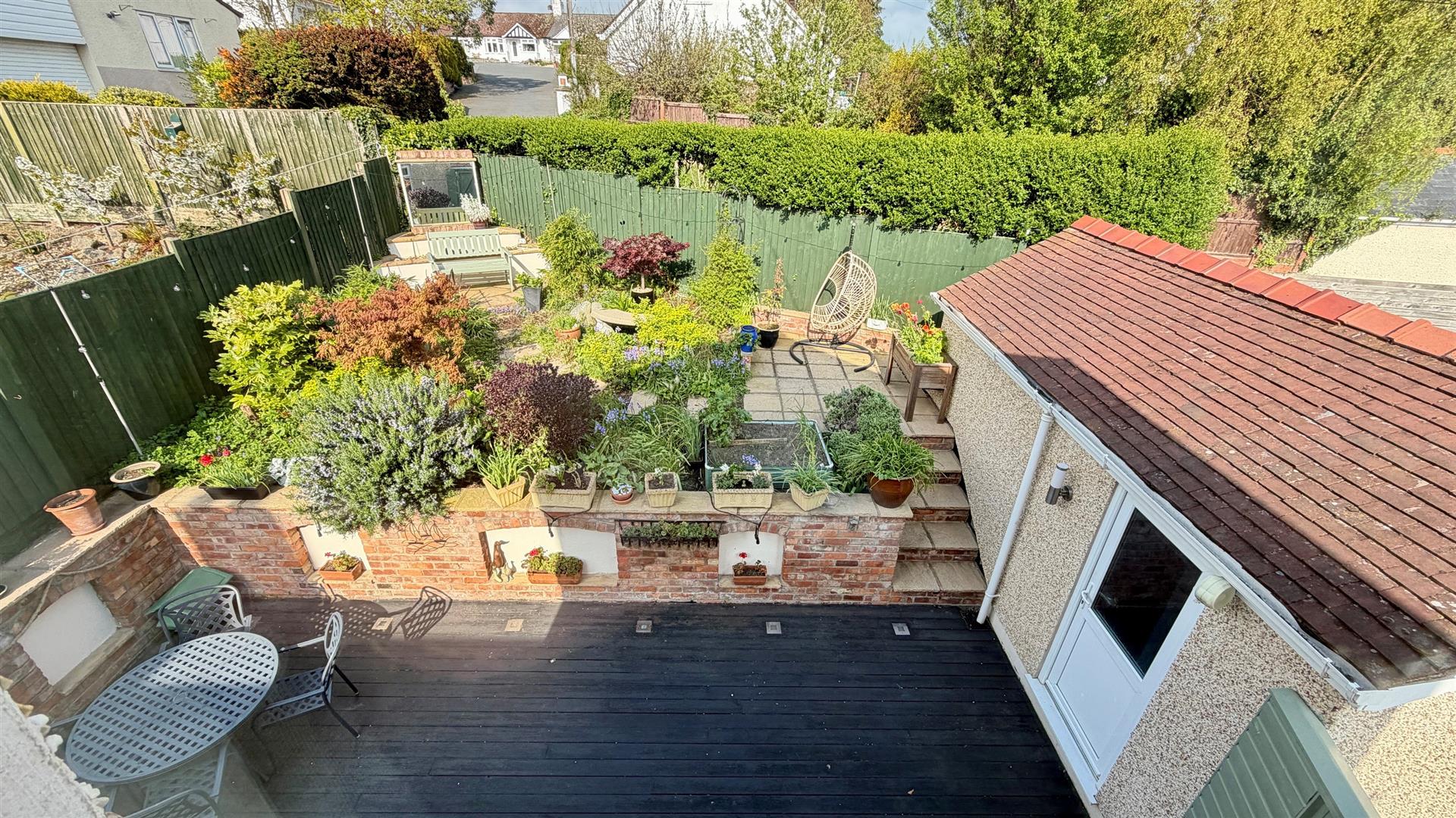 REAR GARDENWell stocked and tiered landscaped rear garden with plants and trees, good sized decking area with seating areas, outside tap, lighting, steps up to the top garden. patios, and shrubs with side gated access.