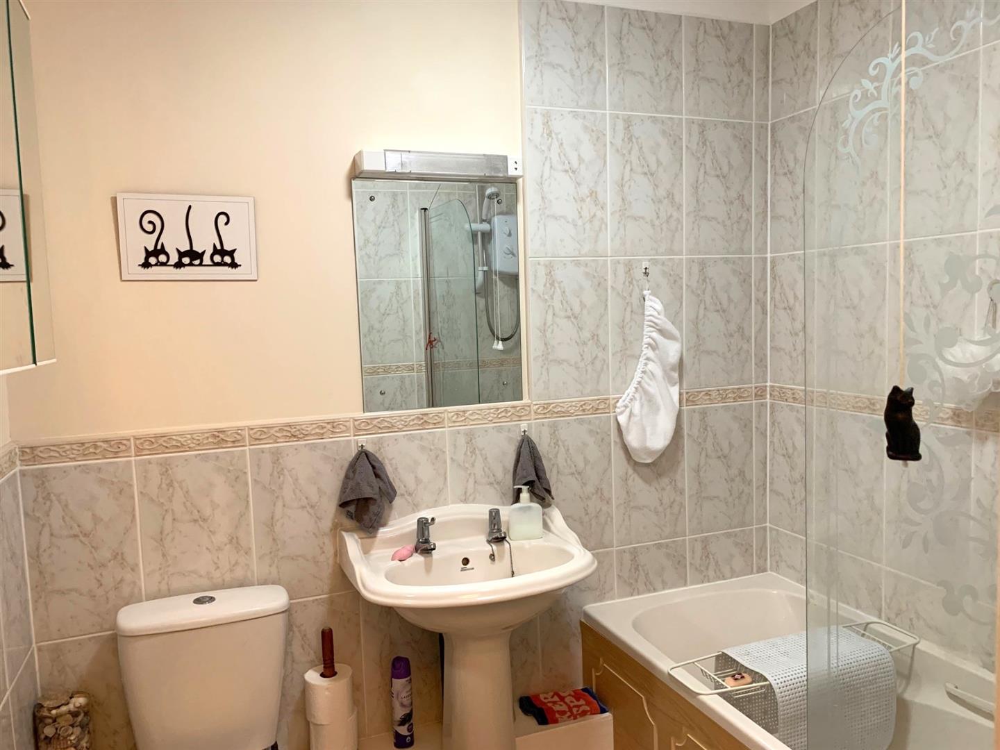 BATHROOMModern white suite comprising panel bath with mixer tap and electric 'Triton' shower over, pedestal wash hand basin, close coupled wc, wall tiling, mirror and shaver light, coving, mirror fronted cabinet, towel heater, wall tiling, tile effect flooring.
