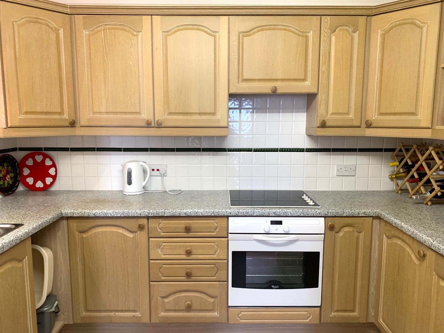 Fitted range of limed oak effect base, wall and drawer units with corner display units and round edged speckled worktops, incorporating single drainer sink unit, integrated 'Whirlpool' electric oven and 4 ring hob with cooker hood over, integrated fridge with freezer section, wall tiling, tile effect flooring, coving, plinth lighting.