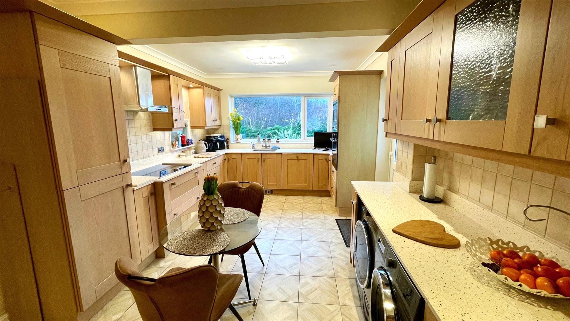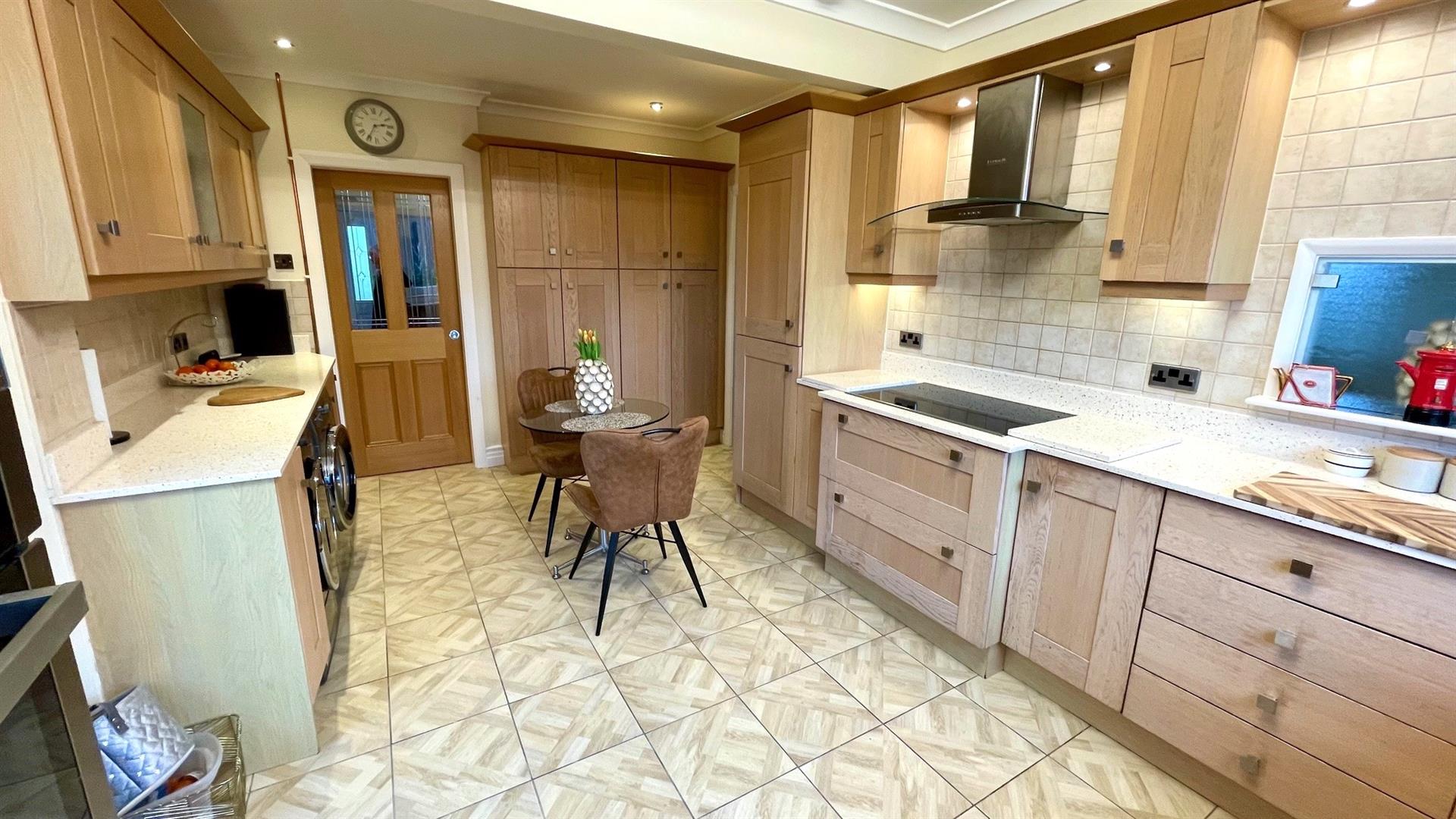 Extensively fitted range of Limed Oak fronted base, wall and drawer units and glass fronted units with quartz speckled worktops and matching uprights incorporating inset sink unit with mixer taps, under unit lighting and integrated 'Blomberg' electric oven and 'Baumatic' microwave/oven, 4 ring 'Blomberg' induction hob and 'Baumatic' stainless steel canopy over, integrated fridge and freezer, wall tiling, plumbing for washing machine and space for dryer, 2 double oak storage cupboards with shelving and top cupboards, coving, floor tiling, electric plinth heater, upvc double glazed window overlooking rear garden and side aspect upvc double glazed door.