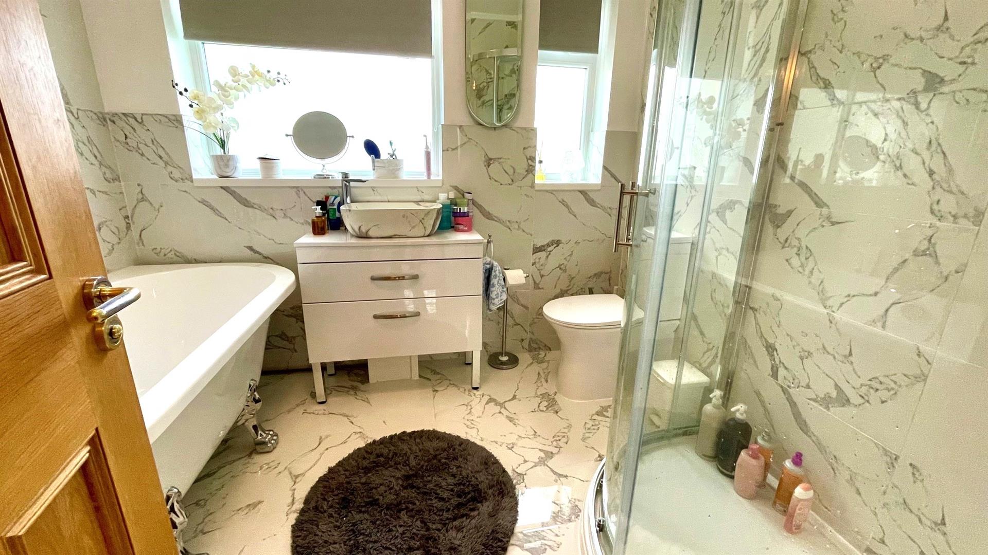 Comprises freestanding bath with claw feet, mixer tap, close coupled w.c, corner shower stall with mains shower, towel rail/ radiator, spotlights, marble effect porcelain wall and floor tiles, 2 upvc double glazed windows.