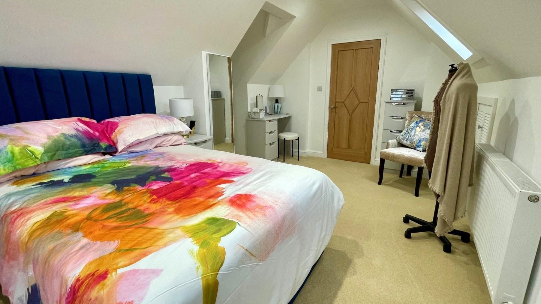 Sloping ceiling with recessed downlighters, 2 velux double glazed skylight windows and upvc double glazed side window, tv point, 2 built in double eaves storage cupboards with louvre doors, double radiator.