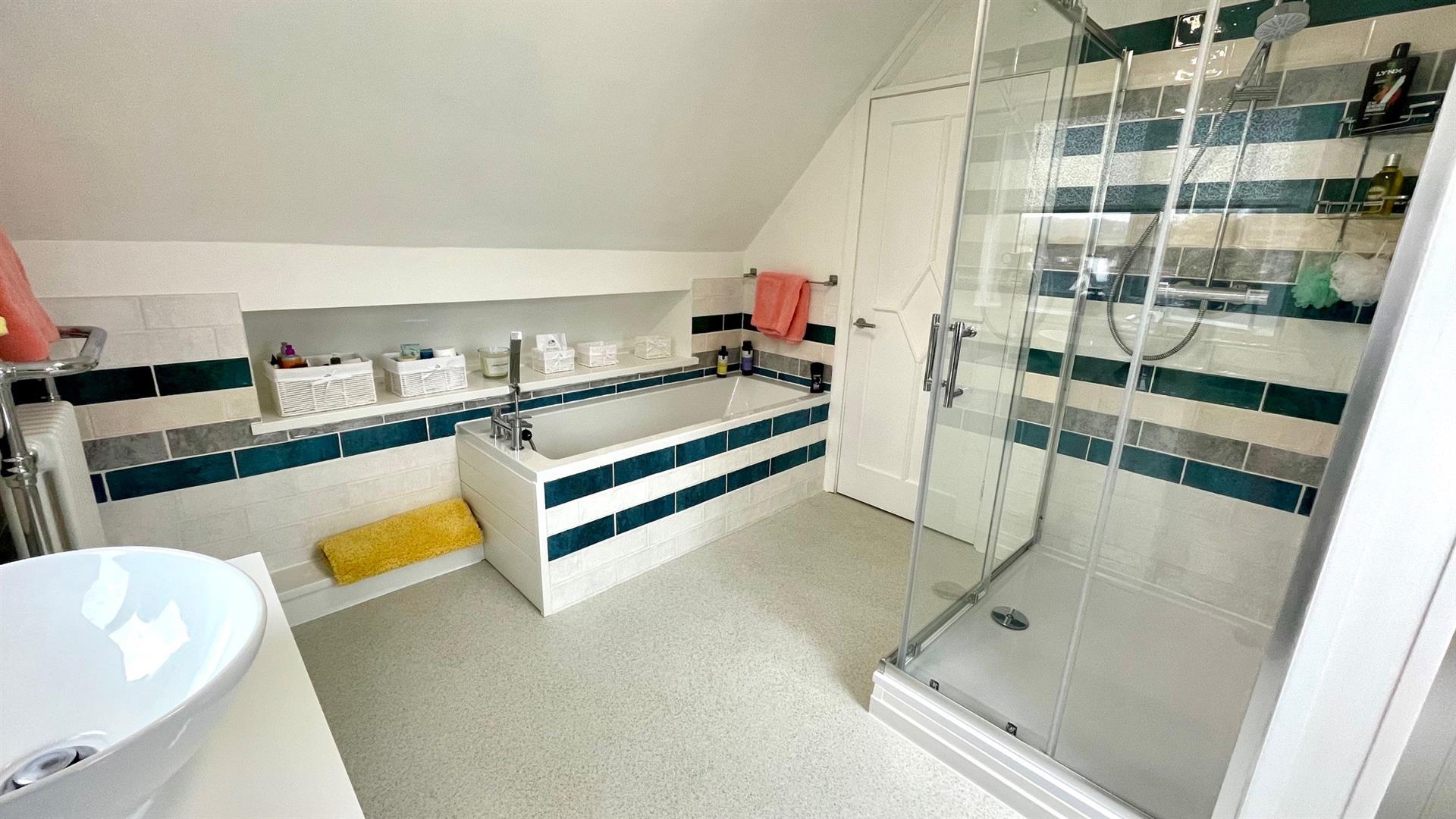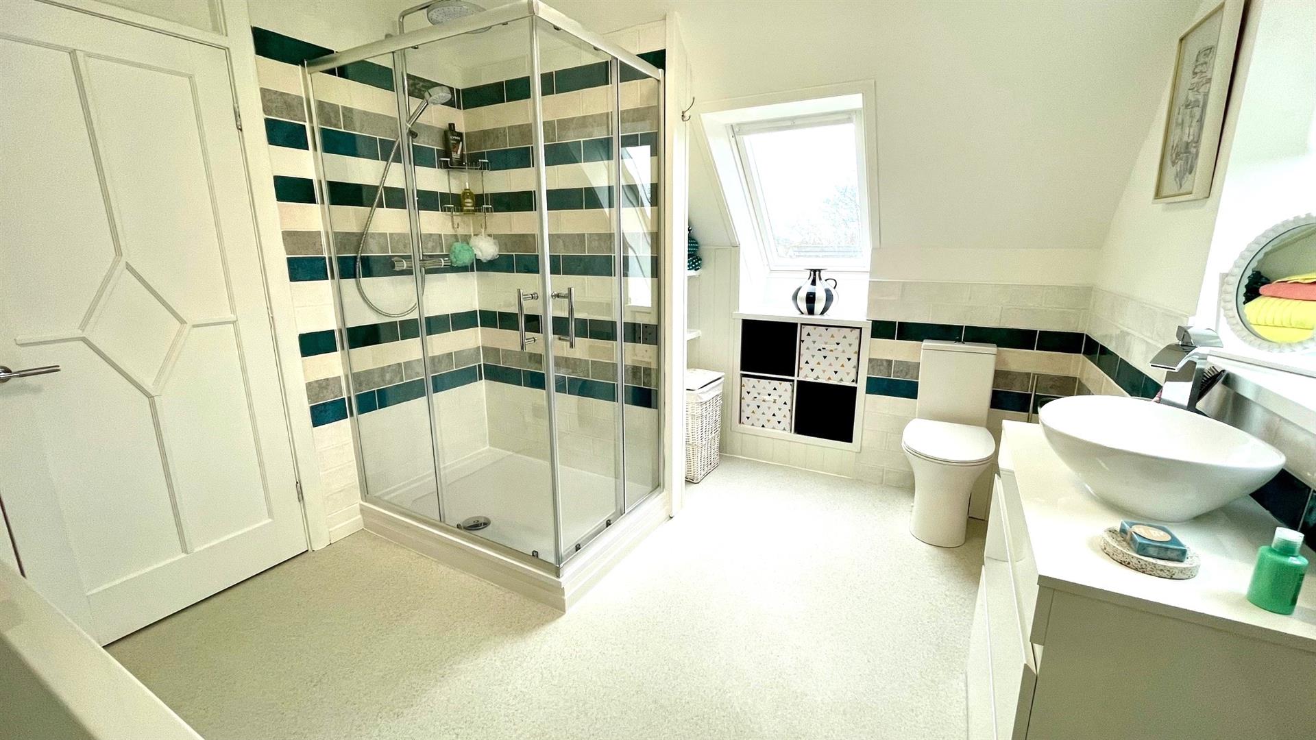 Tiled bath with mixer tap and shower attachment and recessed display shelving, double shower stall with mains shower and twin shower heads including drench shower, vanity wash hand basin and mixer tap, close coupled wc, radiator, towel rail, extractor, shelving, 'Velux' double glazed skylight window and upvc double glazed window, decorative wall tiling and vinyl flooring.