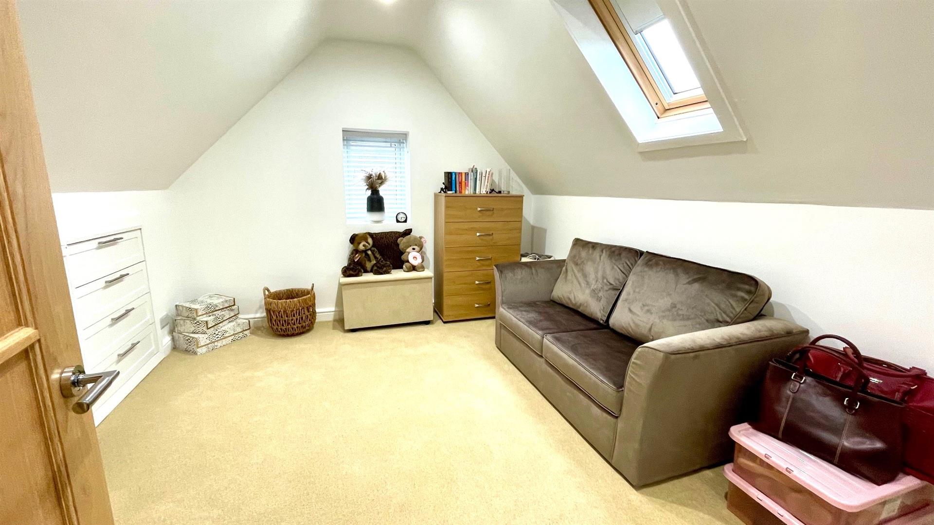 Built in eaves storage cupboard and shelving, upvc double glazed window and 'Velux' double glazed skylight window, tv point, radiator, recessed downlighters to ceiling.