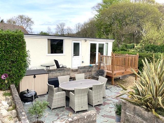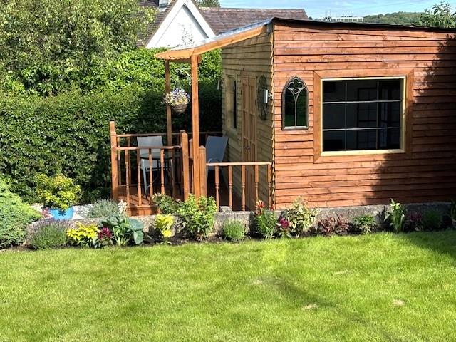 Including modern 2 piece washroom comprising wash hand basin and w.c. and office/garden room with, up and over door, upvc double glazed side door, double opening upvc double glazed patio doors to raised decked area.