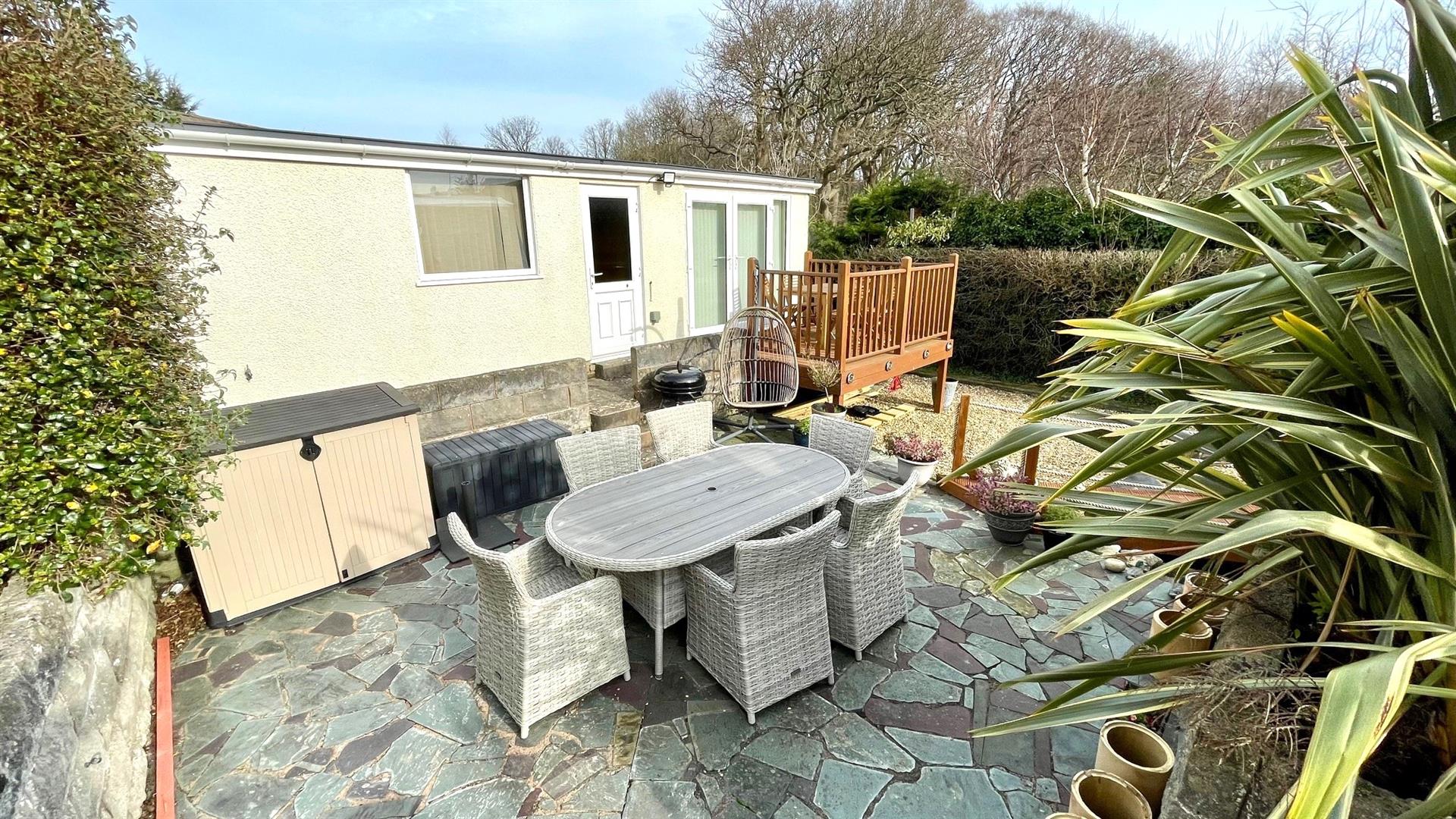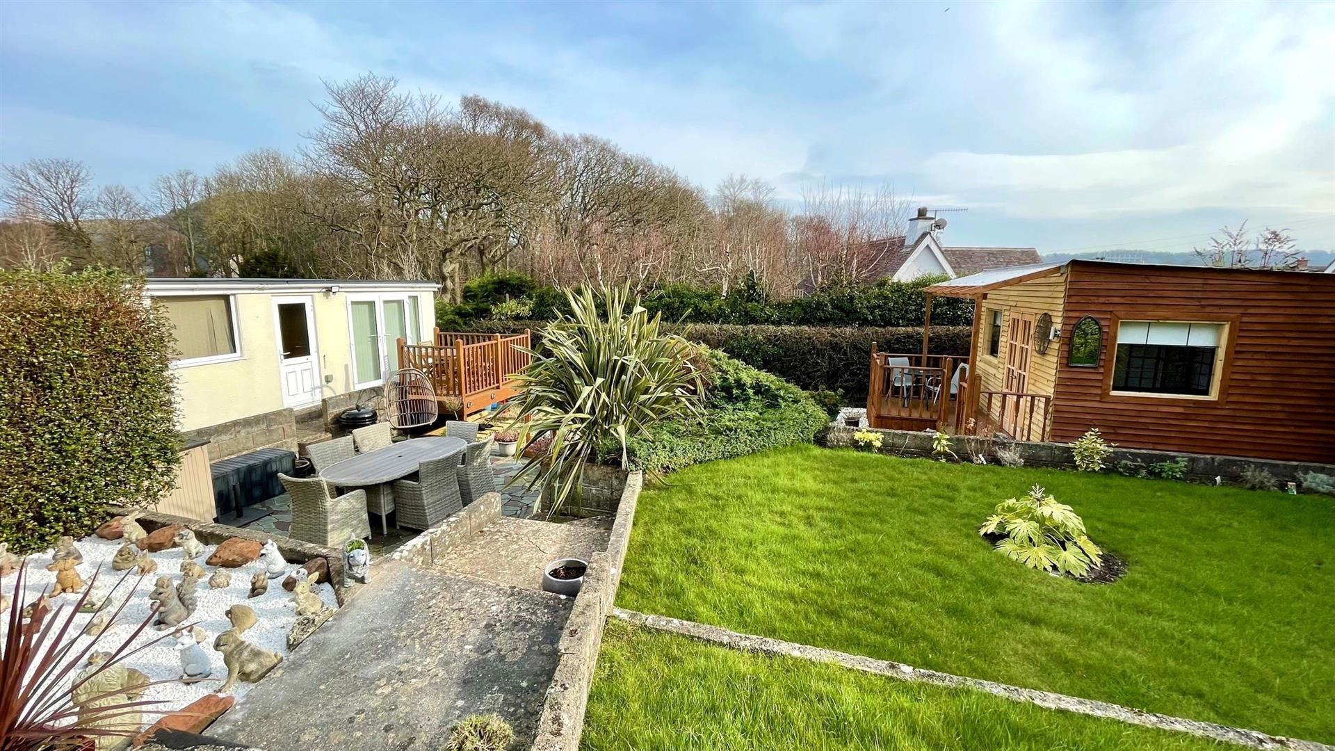 THIS EXCEPTIONAL FOUR BEDROOM DETACHED CHALET STYLE BUNGALOW IS SITUATED WITHIN ½ A MILE OF THE LOCAL SHOP AND HAIRDRESSERS AND WITHIN 2 MILES OF LLANDUDNO TOWN CENTRE having been thoroughly and beautifully upgraded by the present owner to a high quality standard - an internal inspection would be highly recommended. The accommodation briefly comprises: porch; reception hall with oak floor and staircase; lounge with double doors leading to dining room; kitchen/breakfast room with range of modern units and built in appliances; 2 ground floor bedrooms and a tiled 4 piece bathroom including free standing bath with a separate shower stall; first floor landing/study area; principle bedroom leading to a 4 piece en-suite bathroom and a further double sized bedroom. The property features gas fired central heating, upvc double glazed windows. Outside landscaped front garden and drive for off road parking for several cars leads to the garage/office and two piece washroom. Beautifully landscaped gardens to the rear with lawn, flower beds, mature shrubs, patio area, decked areas and a large custom built summerhouse with 6 person jacuzzi and a further patio area.