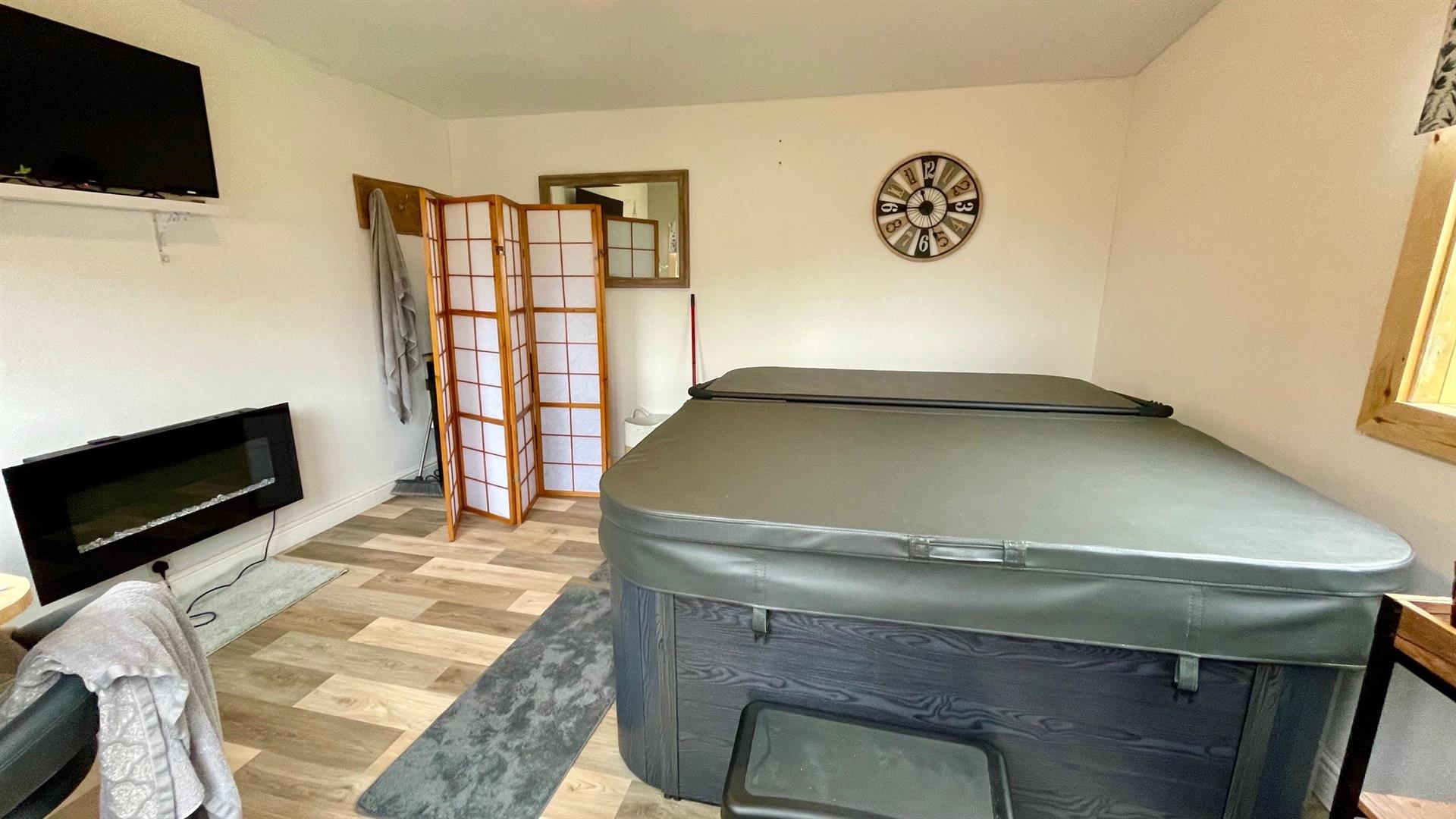 6 person jacuzzi, power and light, external decked raised patio area, lawn, shrubs, trees, chippings, pavings.