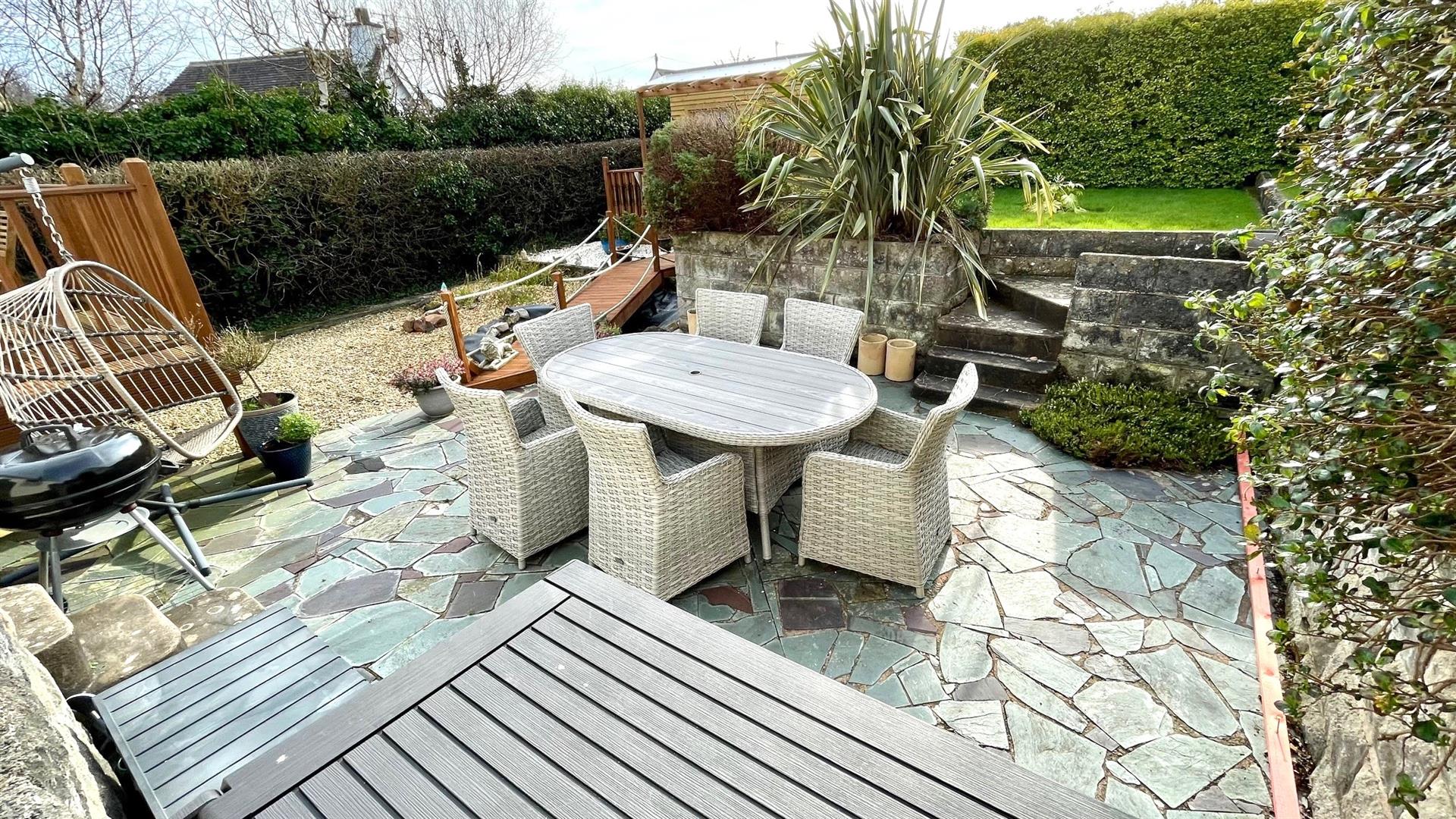 6 PERSON JACUZZI IN SUMMERHOUSEPATIOWalled area with slate crazy paving, seating/barbeque area, raised beds and shrubs.