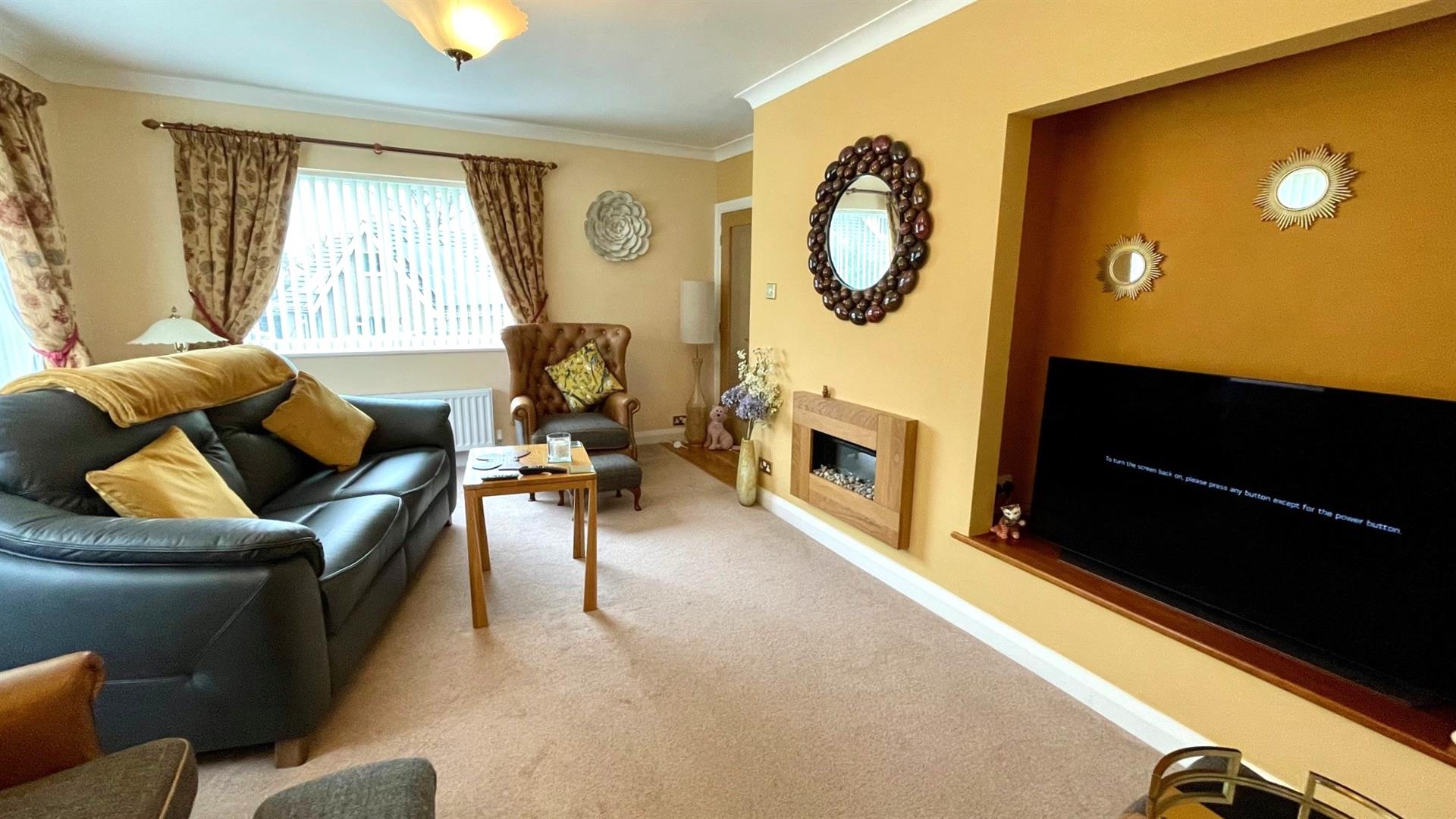 TV point, 2 double radiators, 3 upvc double glazed windows and double glazed windows overlooking rear garden, serving hatch to kitchen.