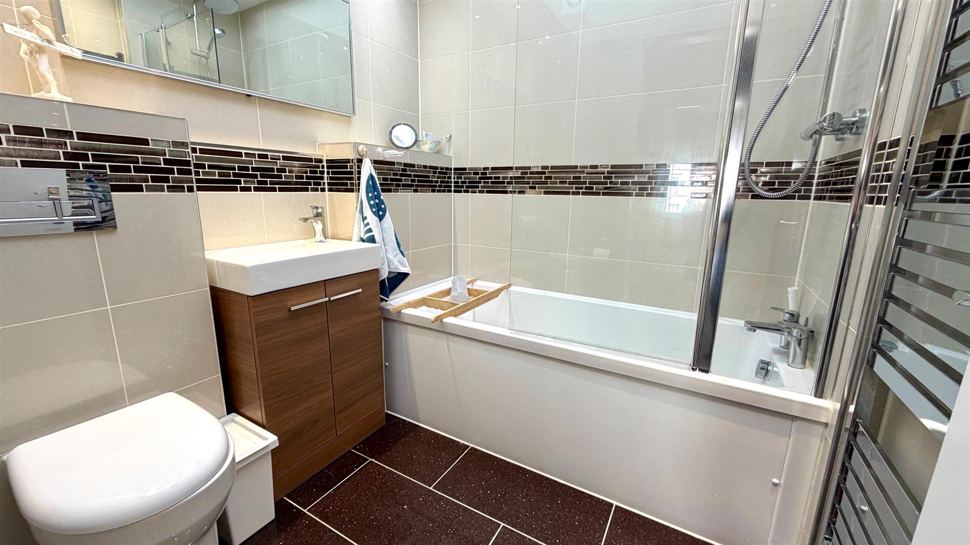TILED BATHROOMComprising panel bath with mains shower over and side screen, vanity wash hand basin, w.c. in white, heated towel rail/ radiator, extractor fan.