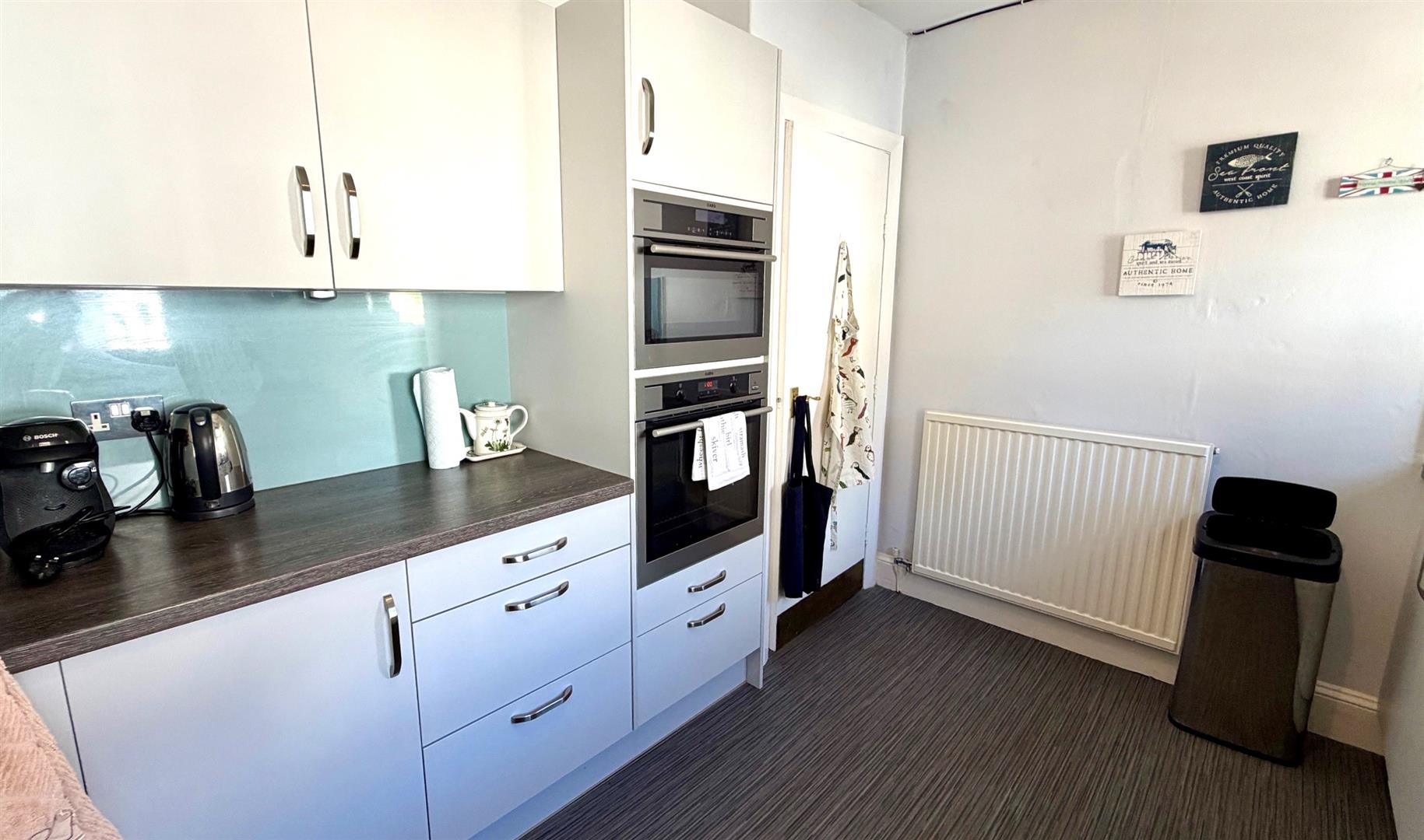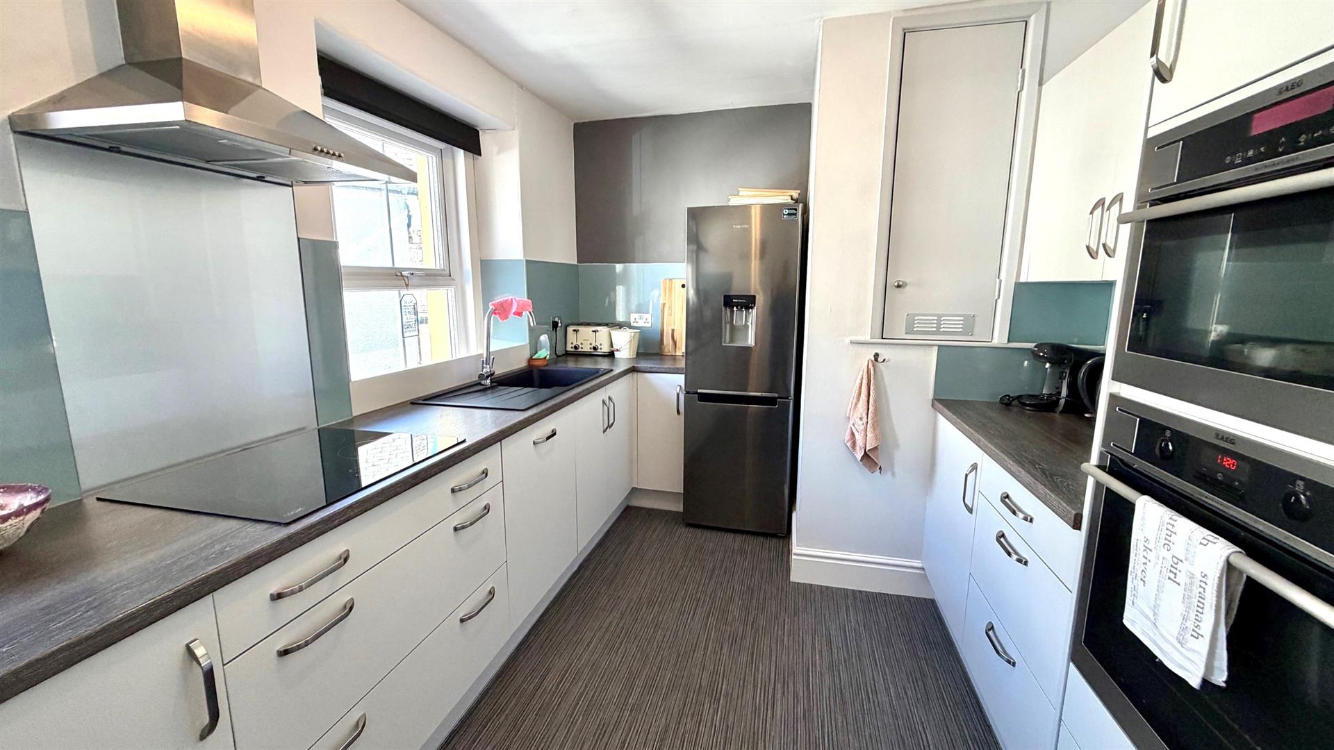 Range of modern base, wall and drawer units, round edge worktops incorporating single drainer sink, built-in double oven with microwave and four ring induction hob with cooker hood over, integrated dishwasher and washing dryer, Fridge/freezer, radiator, upvc double glazed window.